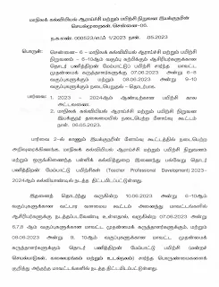 மாநிலக் கல்வியியல் ஆராய்ச்சி மற்றும் பயிற்சி நிறுவனம் - 6-10ஆம் வகுப்பு கற்பிக்கும் ஆசிரியர்களுக்கான தொடர் பணித்திறன் மேம்பாட்டுப் பயிற்சி சார்ந்த மாவட்ட முதன்மைக் கருத்தாளர்களுக்கு 07.06.2023 அன்று 6-8 வகுப்புகளுக்கும் மற்றும் 08.06.2023 அன்று 9-10 வகுப்புகளுக்கும் நடைபெறுதல் - தொடர்பாக SPD Proceedings...